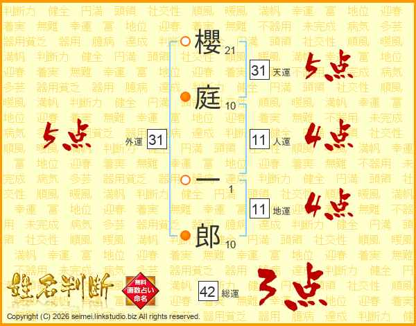 櫻(21画)庭(10画) 一(1画)郎(10画)