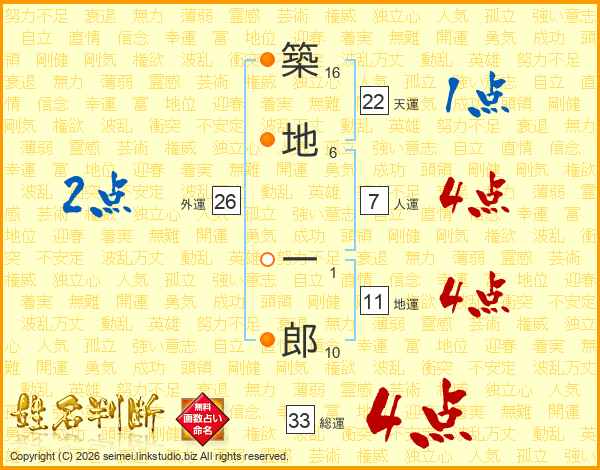 生活面を象徴する運勢です。外部から受ける影響力を表し、結婚運、家庭運や職場、環境への順応性を表します。総運から人運を引いた画数。姓や名が1文字の場合を除く。