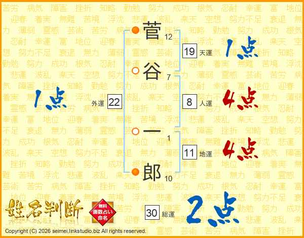 菅(12画)谷(7画) 一(1画)郎(10画)