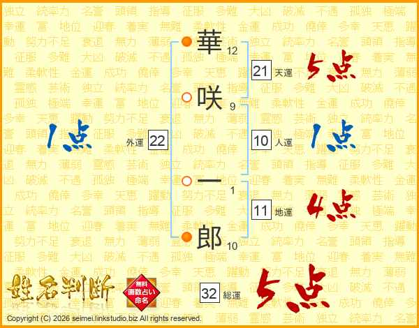 あなたの人生を表す1番重要な運勢です。生涯を通じて影響する総合運となり、主に50歳以降の晩年期に影響を及ぼします。苗字と名前の合計画数。