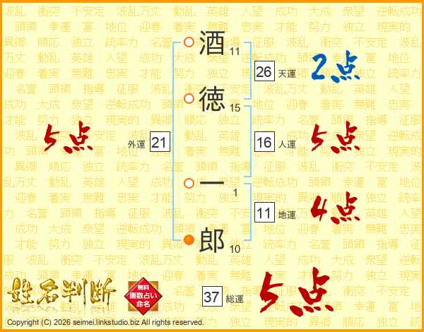 酒(11画)徳(15画) 一(1画)郎(10画)