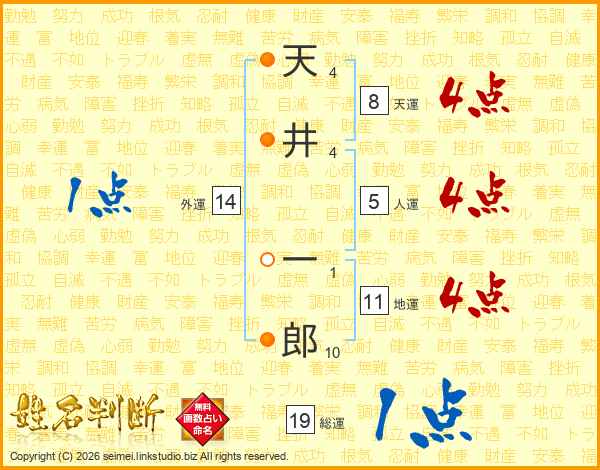 生活面を象徴する運勢です。外部から受ける影響力を表し、結婚運、家庭運や職場、環境への順応性を表します。総運から人運を引いた画数。姓や名が1文字の場合を除く。