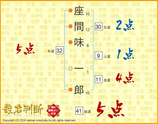 座(10画)間(12画)味(8画) 一(1画)郎(10画)