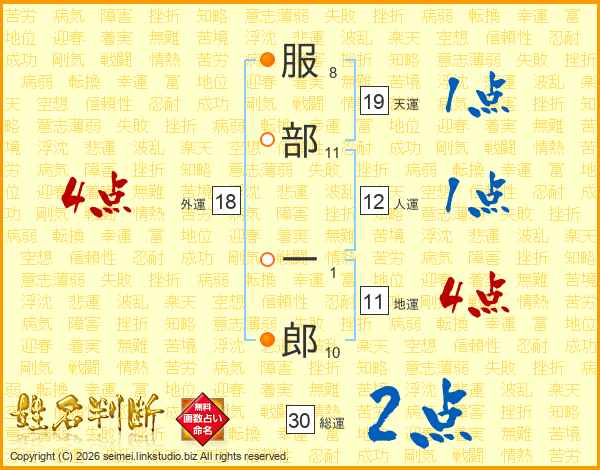 生活面を象徴する運勢です。外部から受ける影響力を表し、結婚運、家庭運や職場、環境への順応性を表します。総運から人運を引いた画数。姓や名が1文字の場合を除く。