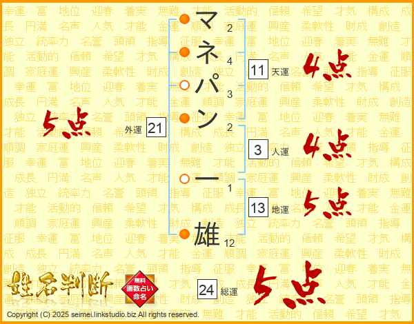 マ(2画)ネ(4画)パ(3画)ン(2画) 一(1画)雄(12画)