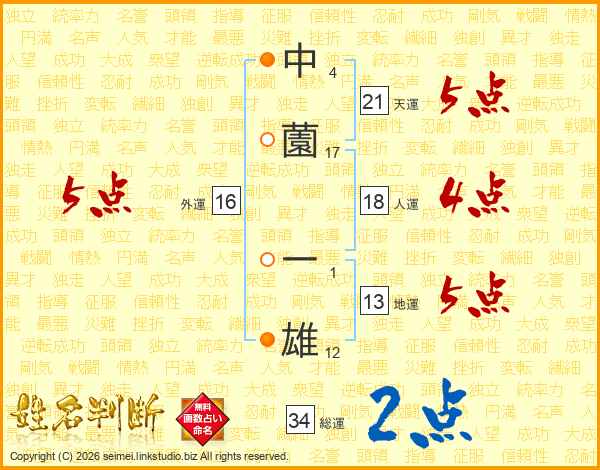 あなたの人生を表す1番重要な運勢です。生涯を通じて影響する総合運となり、主に50歳以降の晩年期に影響を及ぼします。苗字と名前の合計画数。