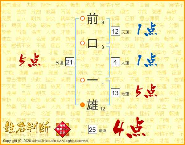生活面を象徴する運勢です。外部から受ける影響力を表し、結婚運、家庭運や職場、環境への順応性を表します。総運から人運を引いた画数。姓や名が1文字の場合を除く。