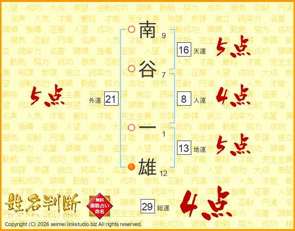 生活面を象徴する運勢です。外部から受ける影響力を表し、結婚運、家庭運や職場、環境への順応性を表します。総運から人運を引いた画数。姓や名が1文字の場合を除く。