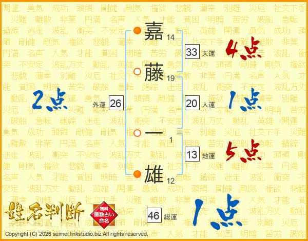 嘉(14画)藤(19画) 一(1画)雄(12画)