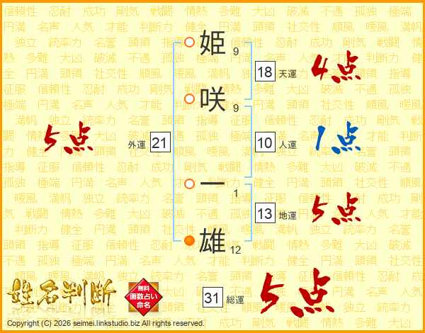 姫(9画)咲(9画) 一(1画)雄(12画)