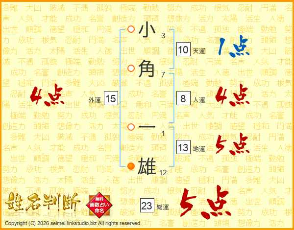 生活面を象徴する運勢です。外部から受ける影響力を表し、結婚運、家庭運や職場、環境への順応性を表します。総運から人運を引いた画数。姓や名が1文字の場合を除く。