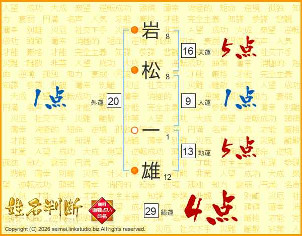 あなたの人生を表す1番重要な運勢です。生涯を通じて影響する総合運となり、主に50歳以降の晩年期に影響を及ぼします。苗字と名前の合計画数。