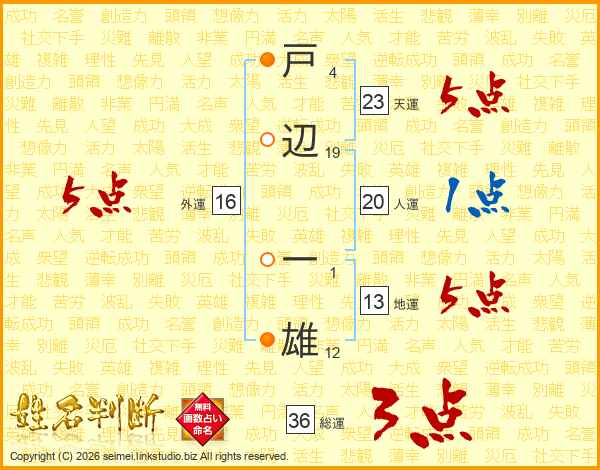 戸(4画)辺(19画) 一(1画)雄(12画)