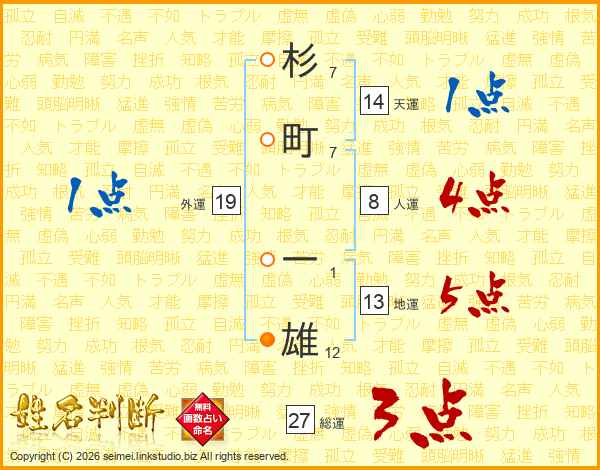 あなたの人生を表す1番重要な運勢です。生涯を通じて影響する総合運となり、主に50歳以降の晩年期に影響を及ぼします。苗字と名前の合計画数。