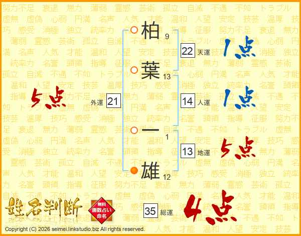 柏(9画)葉(13画) 一(1画)雄(12画)