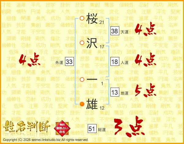 桜(21画)沢(17画) 一(1画)雄(12画)