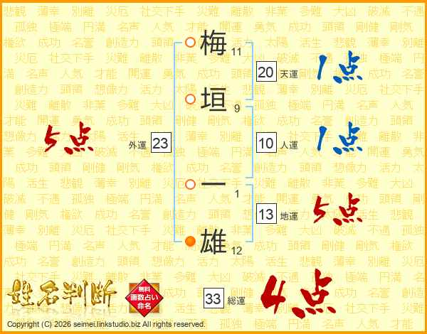 梅(11画)垣(9画) 一(1画)雄(12画)