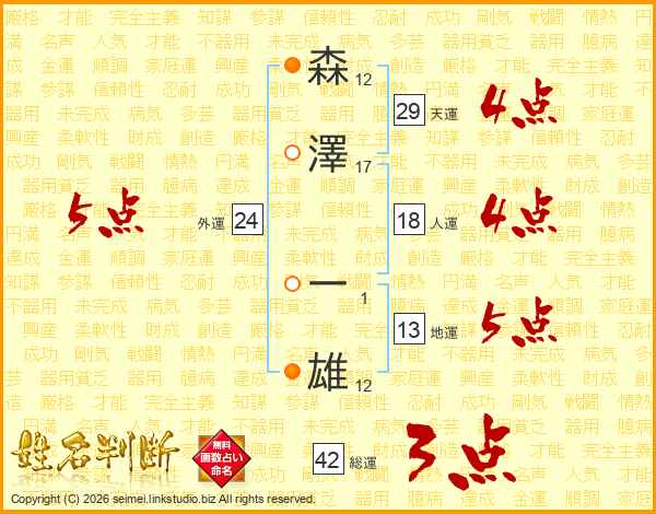 森(12画)澤(17画) 一(1画)雄(12画)