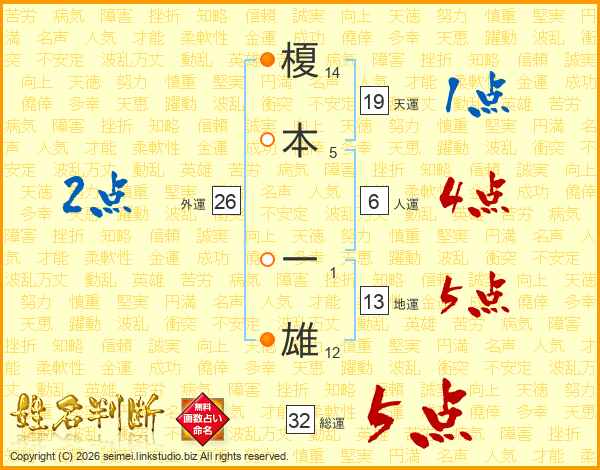 あなたの人生を表す1番重要な運勢です。生涯を通じて影響する総合運となり、主に50歳以降の晩年期に影響を及ぼします。苗字と名前の合計画数。