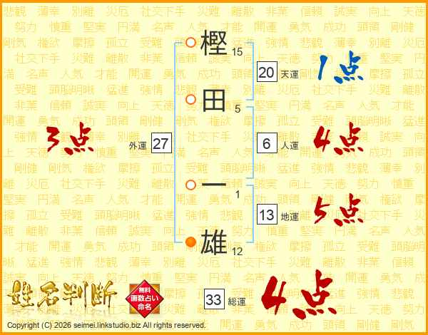 樫(15画)田(5画) 一(1画)雄(12画)