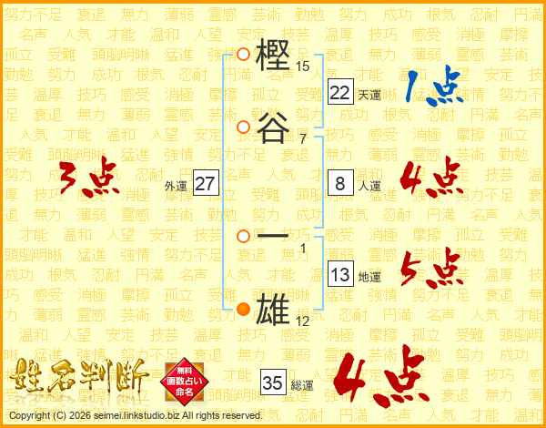 樫谷一雄さんの総運は35画の4点!