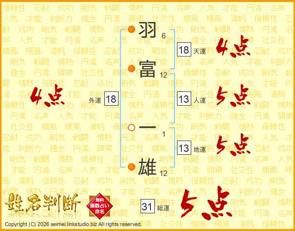 あなたの人生を表す1番重要な運勢です。生涯を通じて影響する総合運となり、主に50歳以降の晩年期に影響を及ぼします。苗字と名前の合計画数。