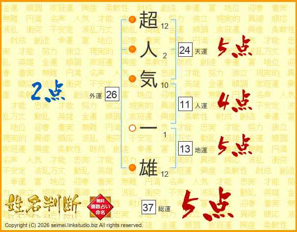 超人気一雄さんの総運は37画の5点!
