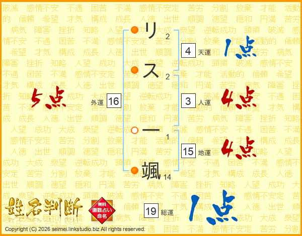 リ(2画)ス(2画) 一(1画)颯(14画)