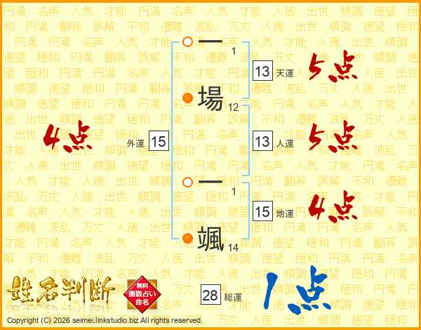 生活面を象徴する運勢です。外部から受ける影響力を表し、結婚運、家庭運や職場、環境への順応性を表します。総運から人運を引いた画数。姓や名が1文字の場合を除く。