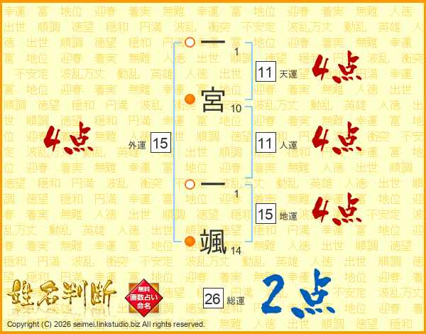 生活面を象徴する運勢です。外部から受ける影響力を表し、結婚運、家庭運や職場、環境への順応性を表します。総運から人運を引いた画数。姓や名が1文字の場合を除く。