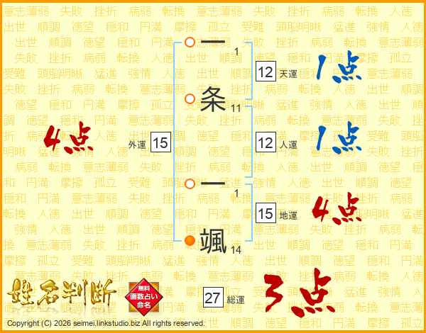 生活面を象徴する運勢です。外部から受ける影響力を表し、結婚運、家庭運や職場、環境への順応性を表します。総運から人運を引いた画数。姓や名が1文字の場合を除く。