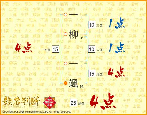 生活面を象徴する運勢です。外部から受ける影響力を表し、結婚運、家庭運や職場、環境への順応性を表します。総運から人運を引いた画数。姓や名が1文字の場合を除く。