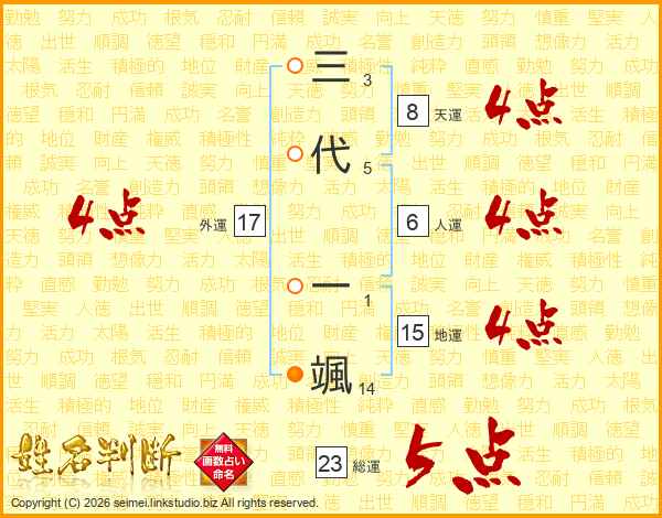 三代一颯さんの総運は23画の5点!