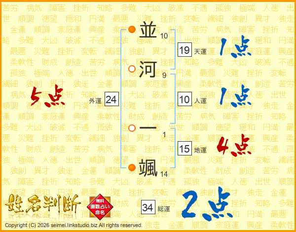 生活面を象徴する運勢です。外部から受ける影響力を表し、結婚運、家庭運や職場、環境への順応性を表します。総運から人運を引いた画数。姓や名が1文字の場合を除く。