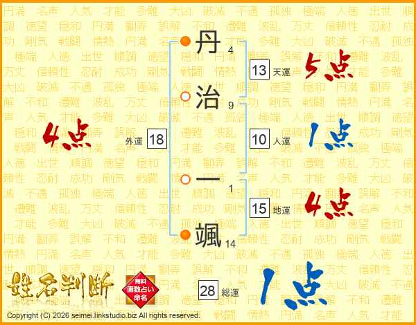 あなたの人生を表す1番重要な運勢です。生涯を通じて影響する総合運となり、主に50歳以降の晩年期に影響を及ぼします。苗字と名前の合計画数。