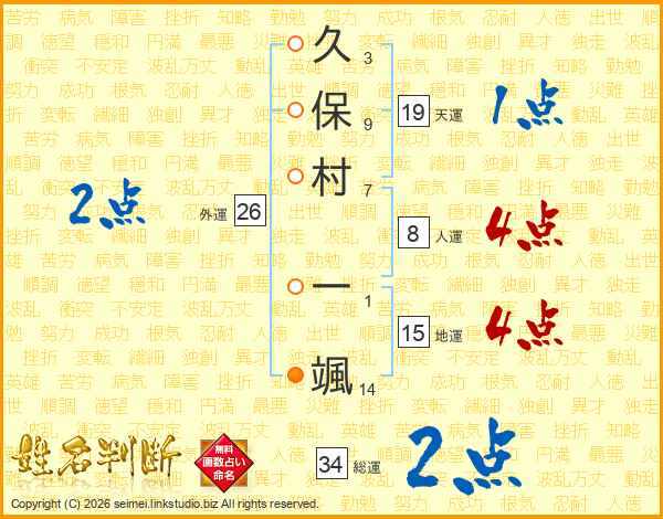 久(3画)保(9画)村(7画) 一(1画)颯(14画)