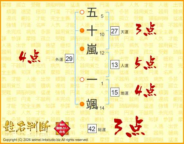五(5画)十(10画)嵐(12画) 一(1画)颯(14画)