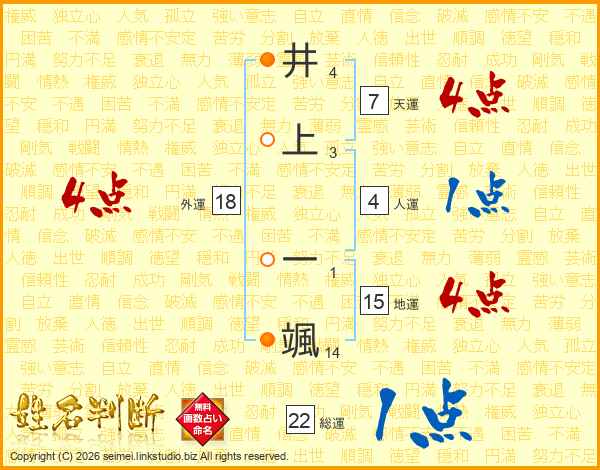 生活面を象徴する運勢です。外部から受ける影響力を表し、結婚運、家庭運や職場、環境への順応性を表します。総運から人運を引いた画数。姓や名が1文字の場合を除く。