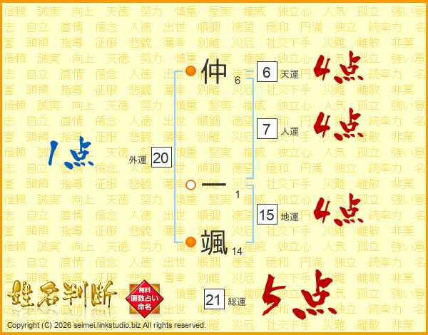 生活面を象徴する運勢です。外部から受ける影響力を表し、結婚運、家庭運や職場、環境への順応性を表します。総運から人運を引いた画数。姓や名が1文字の場合を除く。