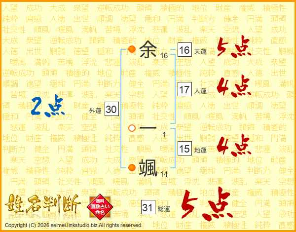 生活面を象徴する運勢です。外部から受ける影響力を表し、結婚運、家庭運や職場、環境への順応性を表します。総運から人運を引いた画数。姓や名が1文字の場合を除く。