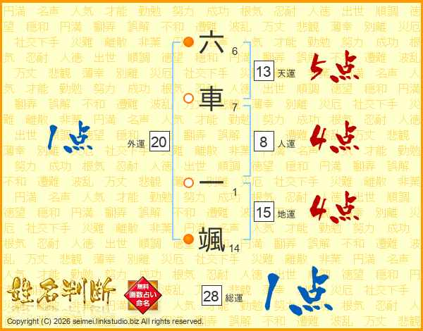 生活面を象徴する運勢です。外部から受ける影響力を表し、結婚運、家庭運や職場、環境への順応性を表します。総運から人運を引いた画数。姓や名が1文字の場合を除く。