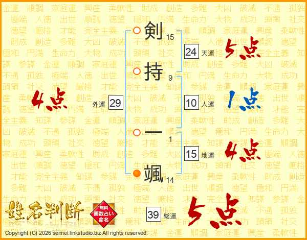家系が持つ宿命的な運勢を表します。祖先から受け継いだ苗字ですので自分の力が及びません。家柄を象徴します。苗字の合計画数。
