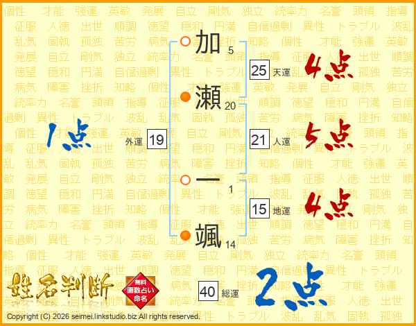 加(5画)瀬(20画) 一(1画)颯(14画)