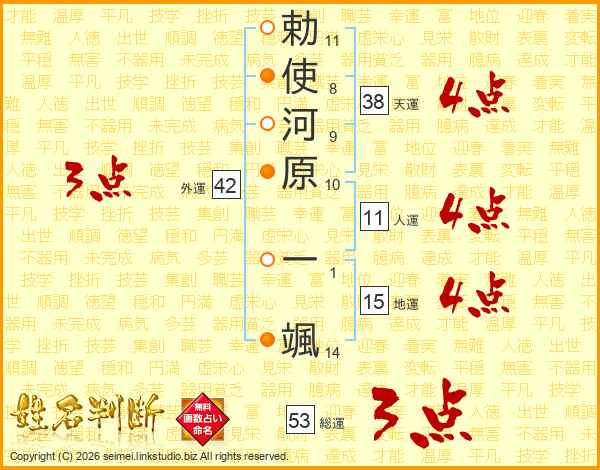 勅(11画)使(8画)河(9画)原(10画) 一(1画)颯(14画)