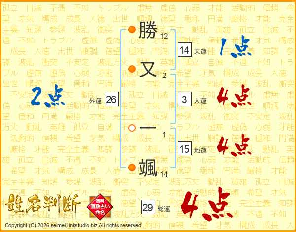 生活面を象徴する運勢です。外部から受ける影響力を表し、結婚運、家庭運や職場、環境への順応性を表します。総運から人運を引いた画数。姓や名が1文字の場合を除く。