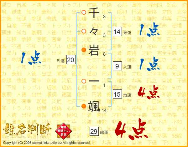 千々岩一颯さんの総運は29画の4点!