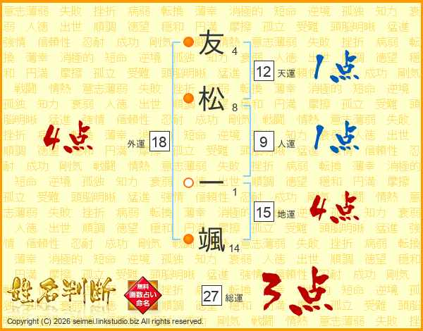 友(4画)松(8画) 一(1画)颯(14画)