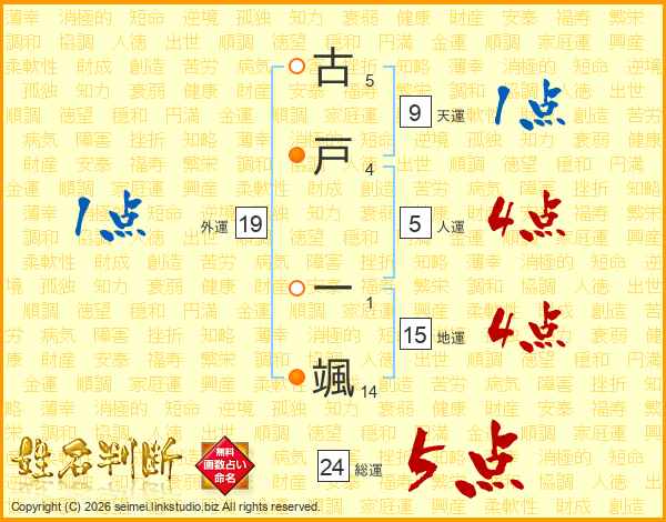 画数の奇数(○陽)と偶数(●陰)の配列で吉凶を占います。どちらかにかたよる名前は大凶名で避ける必要があります。画数の奇数偶数。