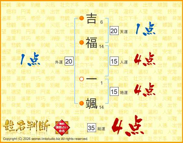 生活面を象徴する運勢です。外部から受ける影響力を表し、結婚運、家庭運や職場、環境への順応性を表します。総運から人運を引いた画数。姓や名が1文字の場合を除く。