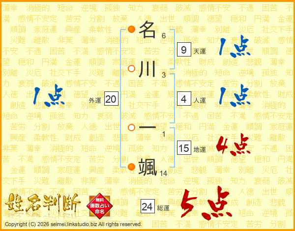 生活面を象徴する運勢です。外部から受ける影響力を表し、結婚運、家庭運や職場、環境への順応性を表します。総運から人運を引いた画数。姓や名が1文字の場合を除く。